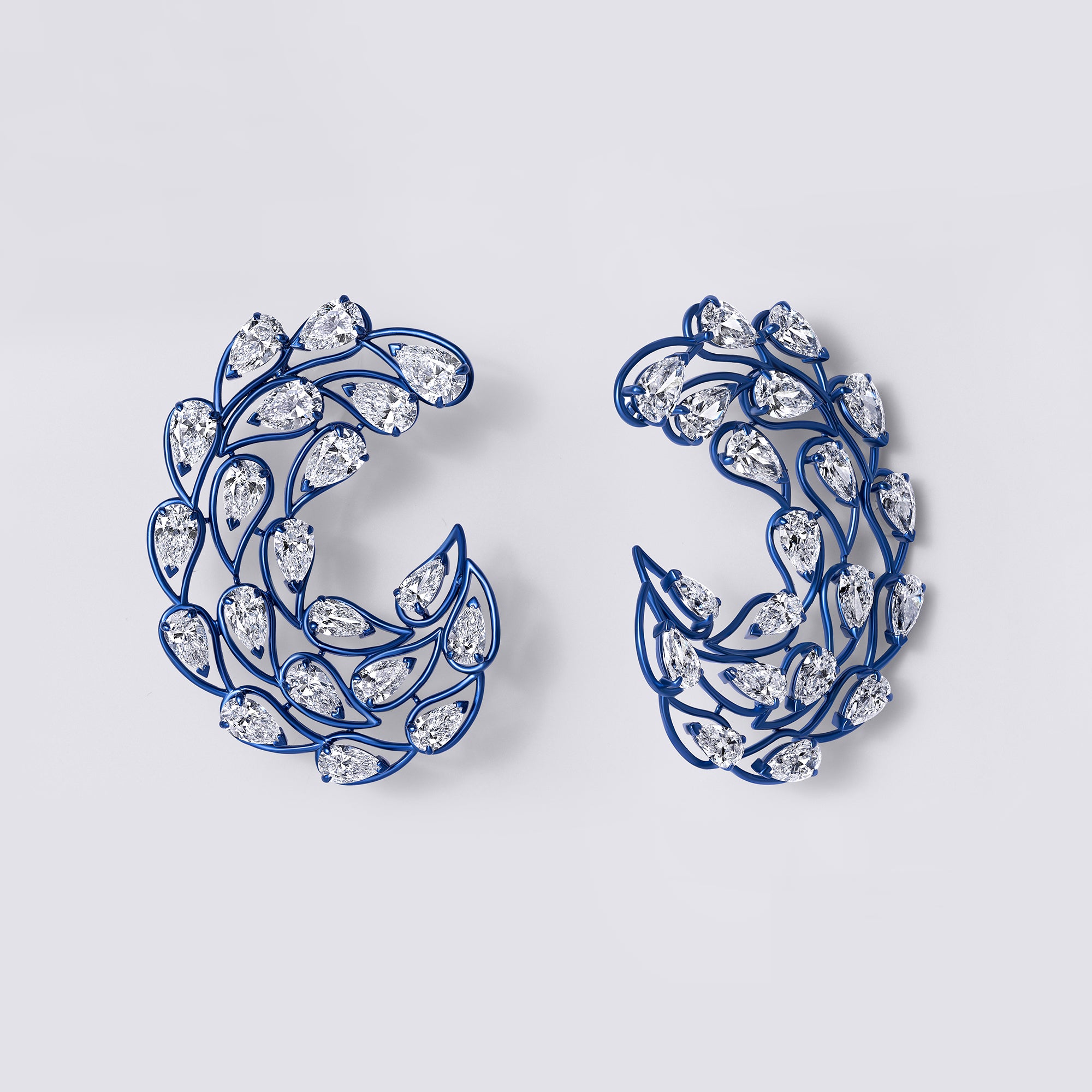 Pear Shaped Vine Earrings (18.6CTW), White Gold and Blue Ceramic