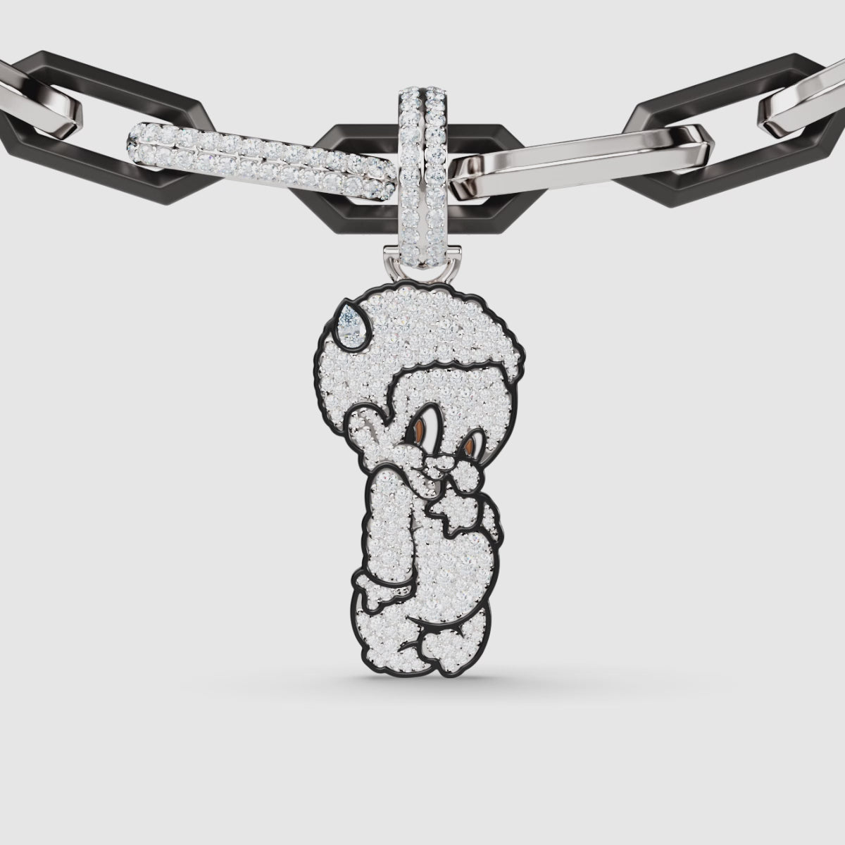 From Shaun Crawford’s “Like Father, Like Son” Collection, this 18K white pavé diamond charm is set on a 925 sterling silver alternating black and white rhodium finished legacy link necklace, blending bold art with refined craftsmanship.