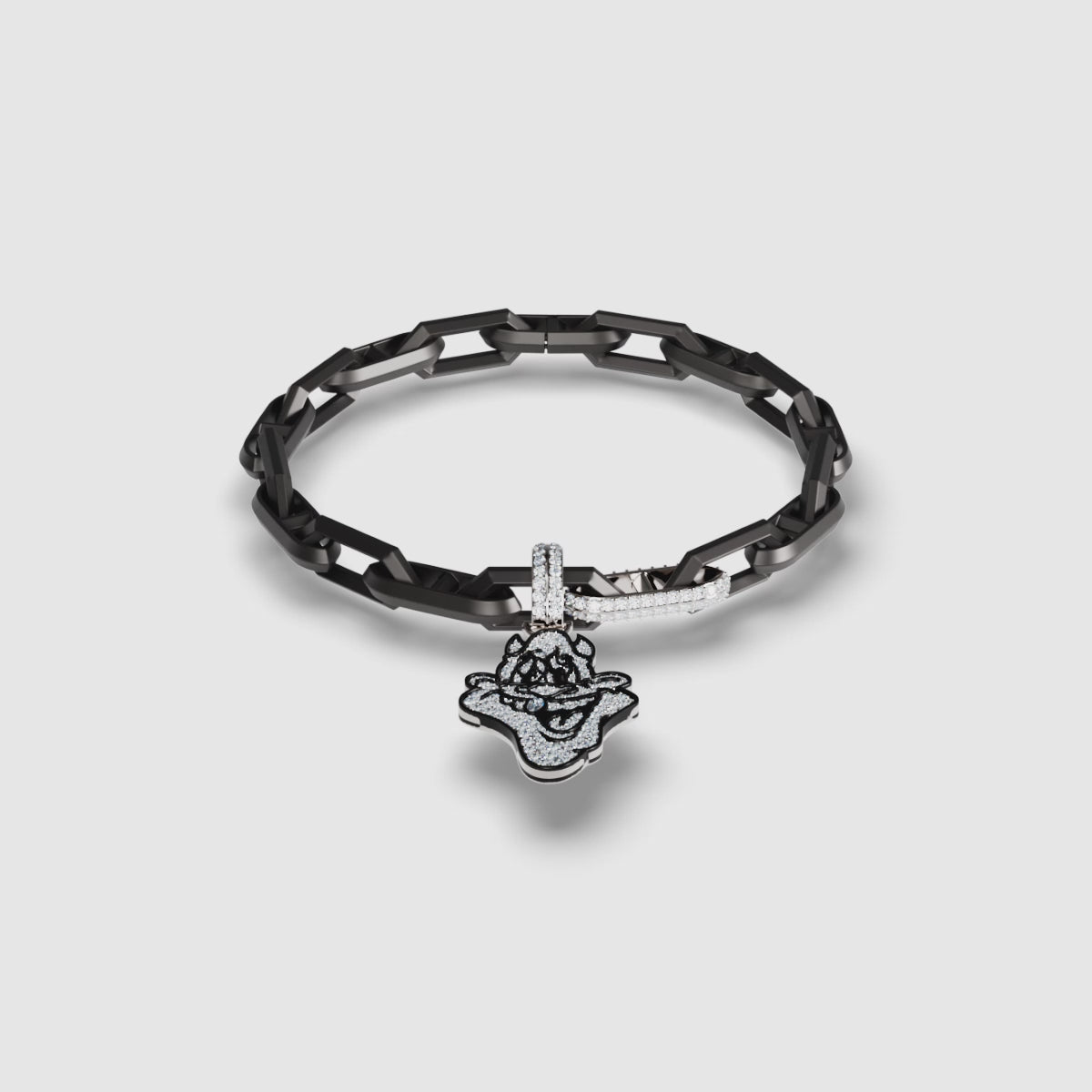 From Shaun Crawford’s “Like Father, Like Son” Collection, this bold 18K white gold pavé charm features lab-grown diamonds on a black rhodium finished sterling silver legacy link bracelet, blending edgy art with refined elegance.
