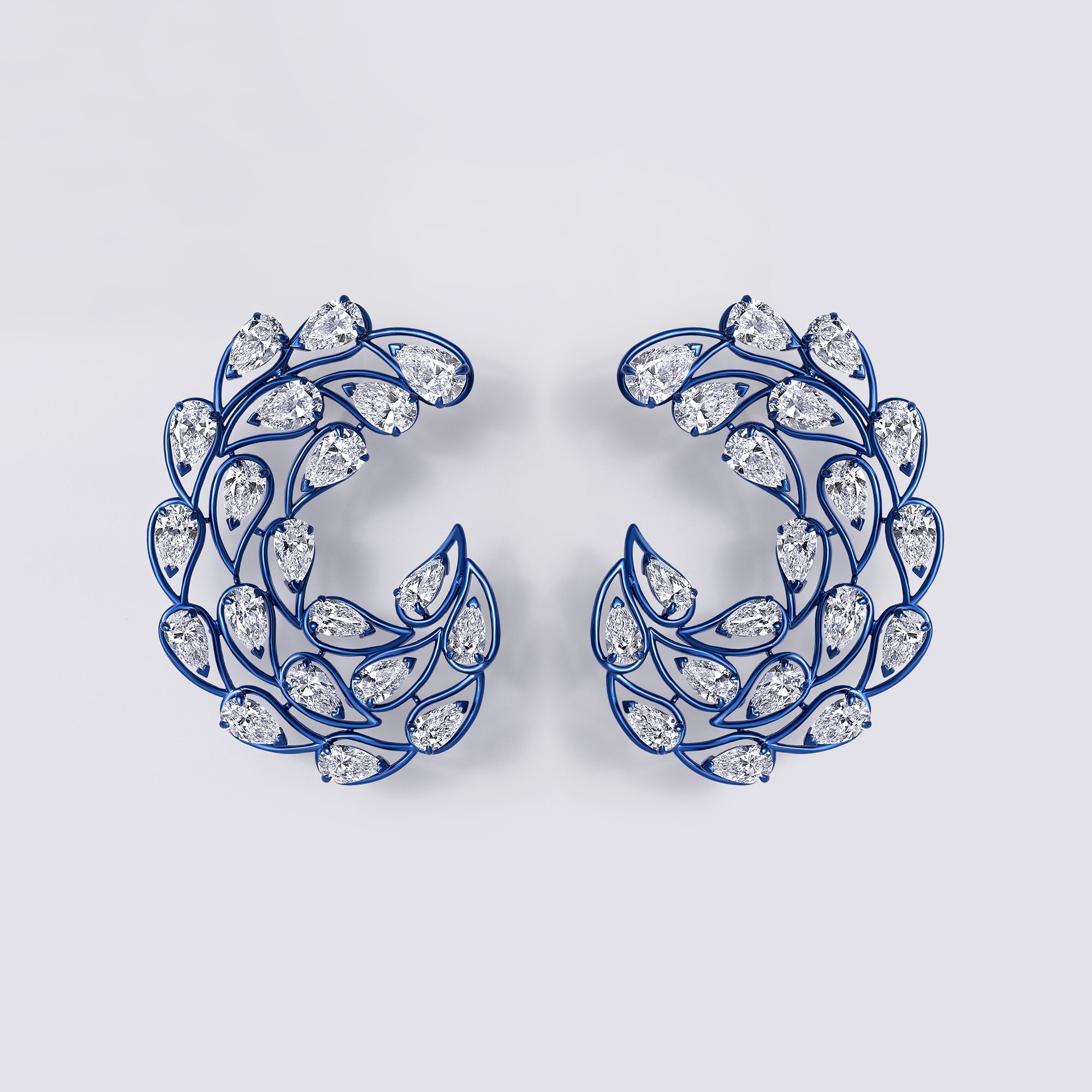 Pear Shaped Vine Earrings (18.6CTW), White Gold and Blue Ceramic